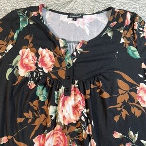 This relaxed blouse features a striking black base adorned with vibrant pink floral patterns, offering a romantic and feminine touch. The flowing fit and soft knit fabric ensure comfort and style, making it a versatile addition to any wardrobe.
