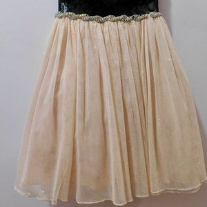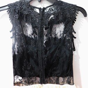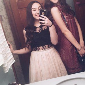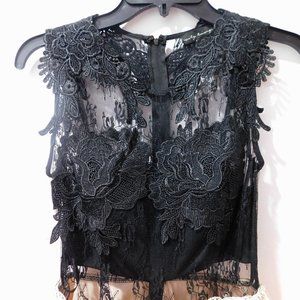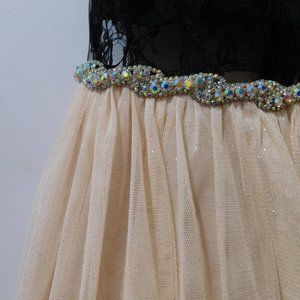 Top is black lace with black material covering the front chest area, but the lower midsection and back are just covered with lace. The bottom is layers of sparkly pink tulle and petticoat material to make it more poofy.