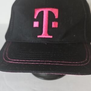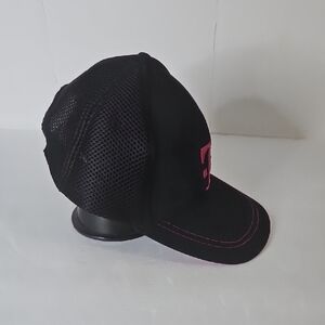Stylish black cap featuring a vibrant pink logo. Perfect for adding a pop of color to your outfit.