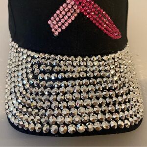 Stylish black cap adorned with pink rhinestones. Perfect for adding a touch of sparkle to any outfit.