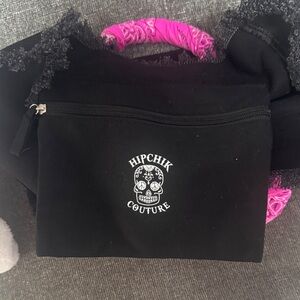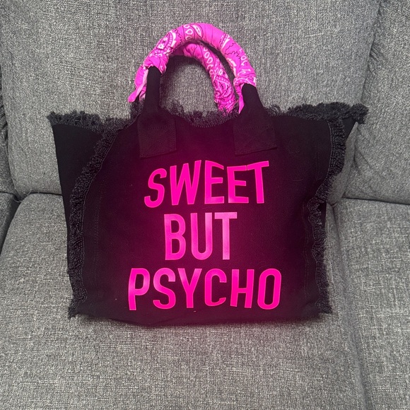 Stylish black tote bag with bold pink lettering. Perfect for adding a pop of color to your outfit.