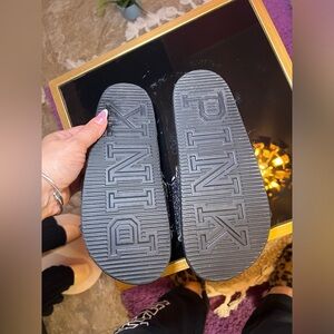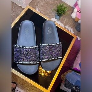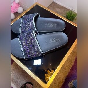 Stylish black slides with purple glitter strap. Features 'PINK' branding.