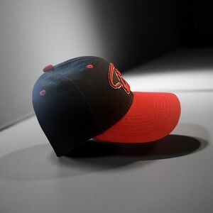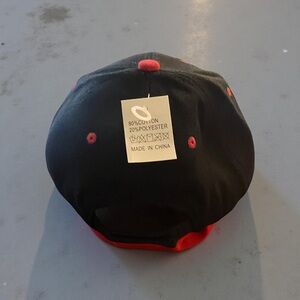 Stylish black and red baseball cap with a unique logo design.