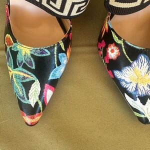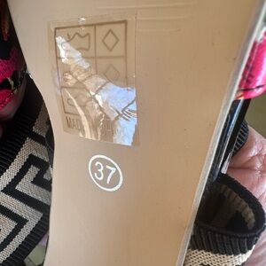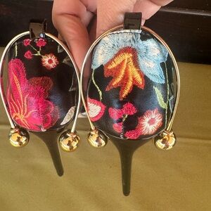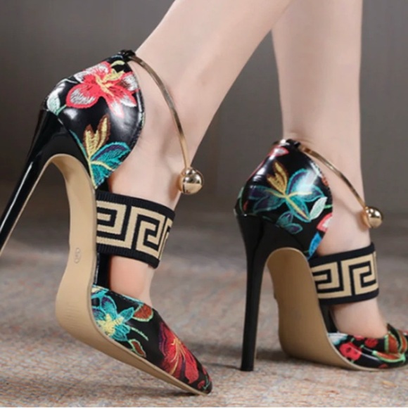 Black and Red High Heeled Sandals with Stiletto Design and Geometric Pat…