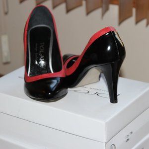 Prime leather used on those unique heels. The heel is 3 inches and they are truly crazy comfortable shoes. The heel in them is stable heel when you walk as those shoes are perfectly measured for ladies feet. Black patent leather with cool red stripe. They will match any outfit you wear. Manufactured in Europe out of best leather and they will last for years of wear.Pictures show beige with orange lather - it is the same shoe so you can see it from all the angles.