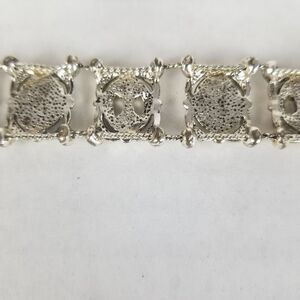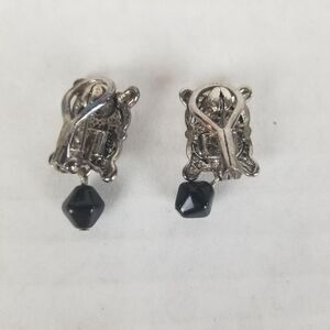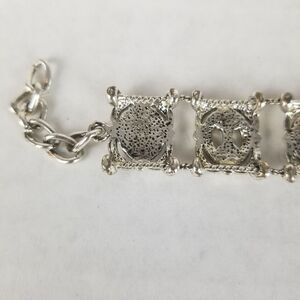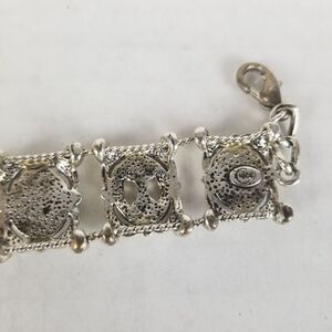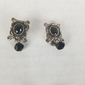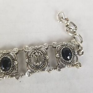 The bracelet measures 8.5" long completely stretched out but has 6 links to allow for size adjustment. The pendant is a beautiful silver pendant with a black stone, but will need a chain. The earrings are lightweight with a small dangling black bead. The earrings are clip-on so no pierced ears necessary to enjoy these beauties!