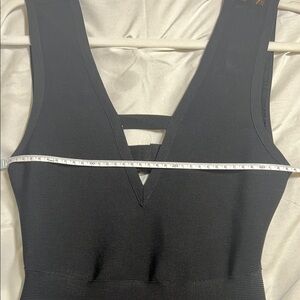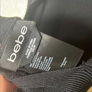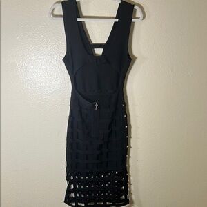 This stunning Bebe caged bandage dress is a sleeveless sheath design, perfect for cocktail occasions. It features a captivating V-neckline and is adorned with intricate silver embellishments that create a striking visual effect against the black fabric. The backless design adds an alluring touch, making it a standout piece for any event.