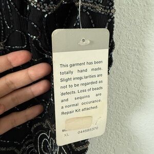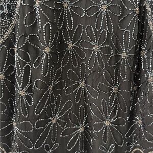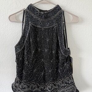 This sophisticated tank top showcases intricate silver embellishments on a luxurious black fabric, creating a stunning evening-wear piece. The sleeveless design and high neckline add a touch of elegance, making it perfect for formal occasions.