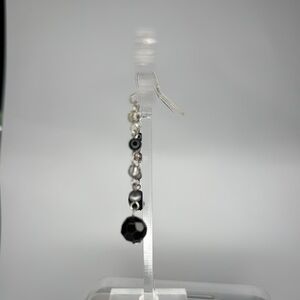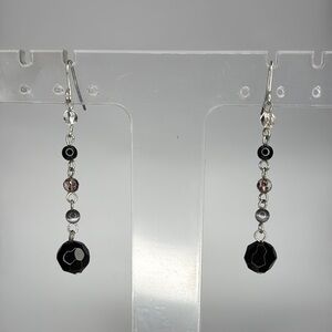 These elegant earrings feature a linear drop design with black onyx-like beads and smaller smoky crystal accents. Suspended from silver-toned hooks, they offer a versatile style suitable for both casual and formal occasions.