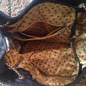 This is a black purse with silver sparkly detailing! Lots of pockets inside with one pocket on the back! Short handled.