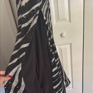 Stunning black and silver sequin prom dress with a striking pattern. Size 0. Built in bra. Slit, gorgeous train. Worn once.