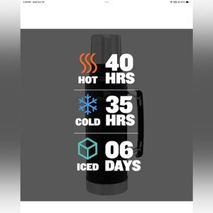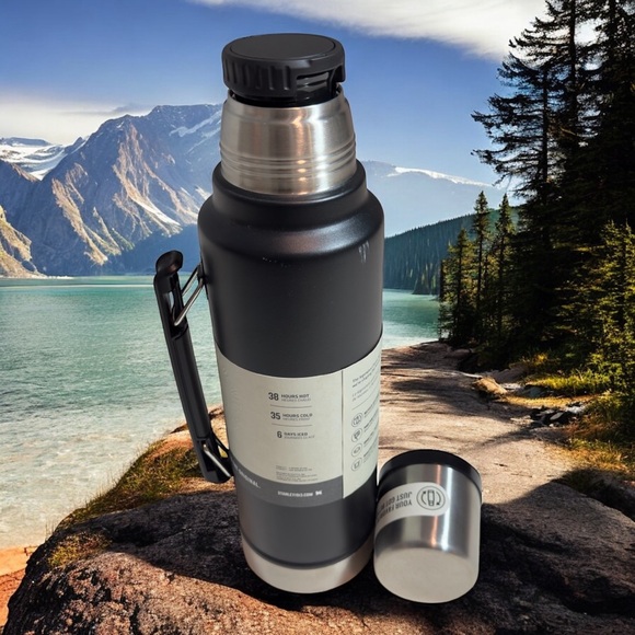 Stanley insulated travel /Durable Stanley bottle for hot or cold drinks. Sleek black and silver design. Ideal for travel and outdoor use.