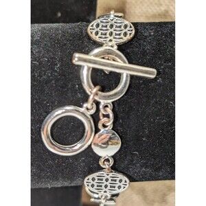 Link silver tone bracelet with black enamel Celtic style design and earrings to match. Measurements are approximate: 7.5 inches, earrings are post and about 3/4 diameter