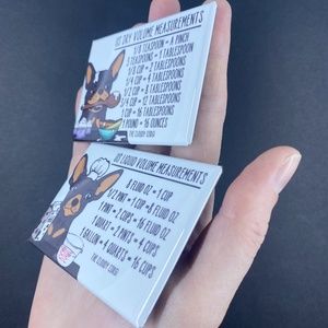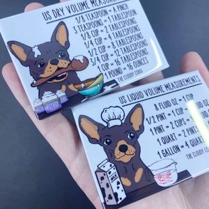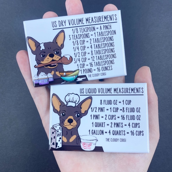 This cute, magnet set contains 2 high quality handmade magnets. There is a dry conversion chart on one magnet and a liquid conversion chart on the other magnet. Each magnet measures 2x3". Makes a perfect gift for Christmas, Mother's Day, Valentine's Day and birthdays! Artwork is my own. All items are handmade in my home studio with a professional press. Thanks for supporting my small business! BUNDLE ITEMS IN MY SHOP & SAVE!
