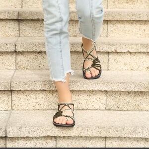 Step into summer with these stylish sandals, featuring a sleek black and tan design. The eye-catching gold chain straps add a touch of sophistication, perfect for casual outings. Enjoy the comfort of a flat sole for all-day wear "Brand new, never used, but without tags."