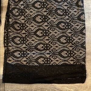 This stunning bodycon midi dress features a black lace overlay with a tan underlay, creating a striking contrast. The long sleeves and v-neckline add a touch of elegance, making it perfect for a cocktail event or a night out. Its form-fitting silhouette and intricate lace pattern ensure a sophisticated and stylish look.