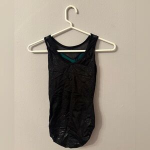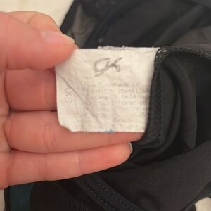 Gymnastics leotard from GK Elite is a special edition Nastia Liukin design. Beautiful black and teal colors with iridescent detailing. Perfect for gymnastics practice!
