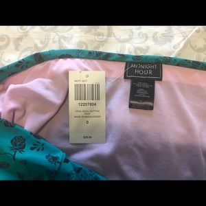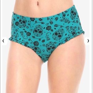 Who says skulls and bright colors don't mix? These teal swim bottoms proves them wrong! Printed all over with decorative black skulls and roses, it features a high-waisted cut with ruffles around the leg openings.