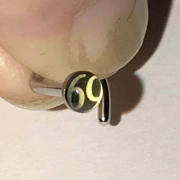 These are 18 gauge C-shaped nose rings. They each have a Design on them that is 3mm round. The nose ring design is Black and white 69. This nose rings is 316-L surgical steel.