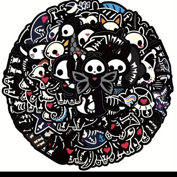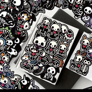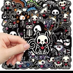 Discover a whimsical collection of black and white cat faces, featuring large round eyes and playful expressions. Some cats are depicted as skeletons, adding a unique twist to their cartoonish charm. Perfect for Halloween-inspired decor or adding a touch of fun to any space. 17 pack