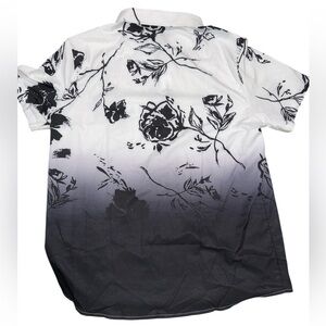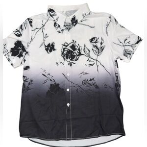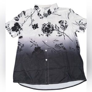This casual button-down shirt features a striking black and white ombre effect, enhanced by a bold floral print. Its lightweight fabric and short sleeves make it perfect for warm weather, offering both style and comfort.
