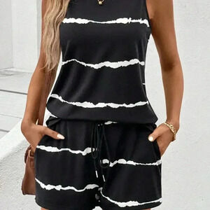 Black and White Casual Women's Printed Sleeveless Top And Shorts Set
