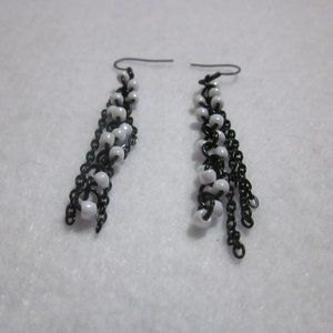 Handmade with black chain links & white, glass seed beads. Nickel free ear wire.