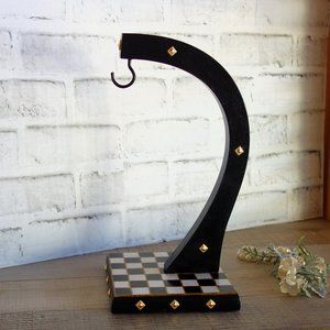 Wooden vintage banana tree, banana hanger, banana holder, banana hook, banana keeper is hand painted with black and white checked pattern, solid wood composition and vintage gold trim. Checkerboard design base with goldtone accents, black arm and matching goldtone accents. A stunning checkered collectible to add to your courtly checked decor kitchen and dining area. Padded protectors underneath to protect tabletops and countertops. 11-1/2" tall, 5-1/2" wide; weight 14 oz. Insured shipping.