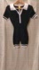 Stylish black knit romperwith white collar and stripes, ribbed sleeves and waist. Features a button-up front.