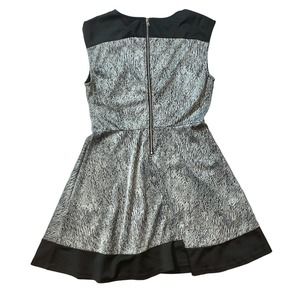 Details: Sleeveless, round neck, contrasting hem and shoulders, visible zippered back, a-line, fit and flare, black and white crackled print colored, slight stretch, mini/right above the knee