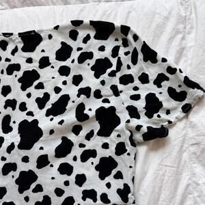 Stylish black and white cow print crop top, perfect for a trendy look. Features a flattering tie front design.