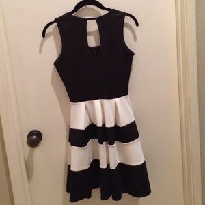 Worn once! Black top with no sleeves, black and white striped bottom, has small teardrop shaped opening in back, stretchy, tiny bit of dirt on front. Can be worn as a casual and formal outfit, perfect for any occasion!