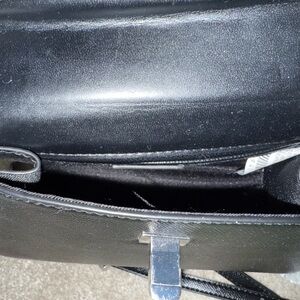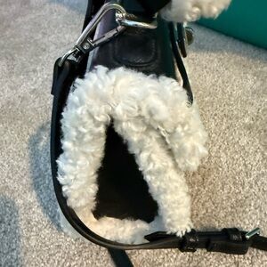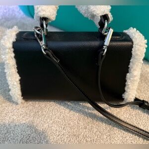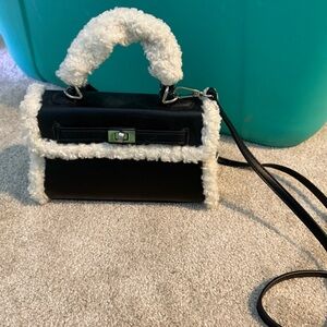 Chic and stylish handbag with a unique faux fur trim. Perfect for adding a touch of elegance to any outfit. Features a sleek black design with contrasting white accents.