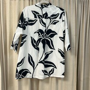 Black and White Floral 3/4 Sleeve Button-Up Shirt With Front Pocket - Alembika