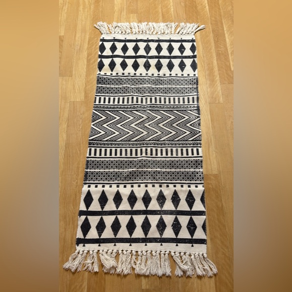 Stylish rug with a black and white geometric pattern. About 4ft long 23 in wide. Cute to even layer under a door mat, or bathroom, mini runner. No longer my style!