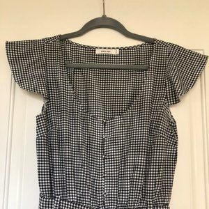 This black and white gingham jumpsuit is so fun to wear and is super unique. Was only worn twice. Comes with a belt so you can really accentuate your waist. I love the cap sleeves + tiny button detailing on the front of this jumpsuit. The only reason I'm selling this item is because it doesn't fit anymore! Legs are a straight leg fit. I always pair this jumpsuit with heels and it makes my legs look SO long!