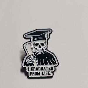 Unique pin featuring a skull in a graduation cap. Black and white design. Perfect for adding a touch of humor to your outfit.