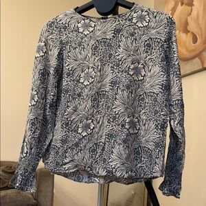 This relaxed blouse features a striking black and white graphic design, complemented by a charming peter pan collar. Its lightweight fabric and stylish pattern make it a versatile addition to any wardrobe.