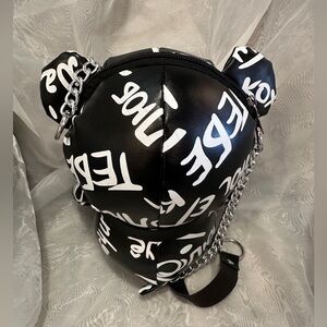 Unique teddy bear bag with bold black and white graphics. Features a chain strap for easy carrying.
