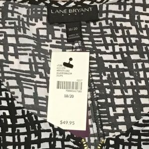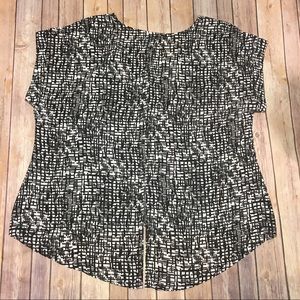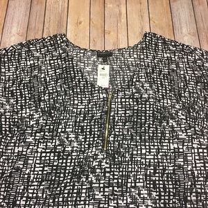 This abstract black and white print top is perfect for the office and can be paired with dress pants or a pencil skirt. It has a gold zipper on the front and a split in the back(pictured open for emphasis). New with tags! Size 18/20. Machine washable.