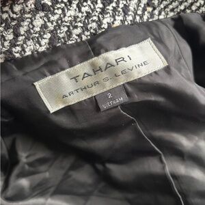 Stylish black and white houndstooth coat with a belt. Features a classic design with button details. Size 2 tahari 3/4th sleeve belted