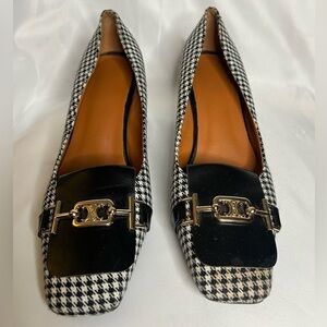 Black and White Houndstooth Heeled Loafers. Small houndstooth print. Leather fold over flap on the front with gold horsebit emblem. Subtle discoloration on the toes, will likely come out with a bit of cleaning. Has an overall luxurious feel. Heel height is 2 3/4 inches. Size 39 which is equivalent to about a US 8 1/2.