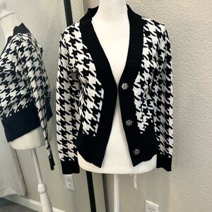Black and white houndstooth sweater. XS but can also fit a small! Snap buttons. Looks great buttoned or unbuttoned. Perfect for any occasion. Its classic design offers a timeless look.