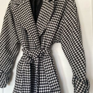 Stylish black and white houndstooth trench coat. Features a classic design with a tie waist. 41” length