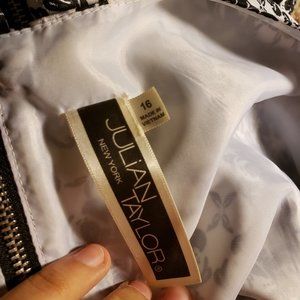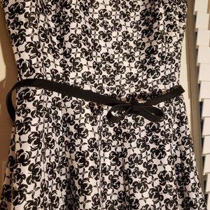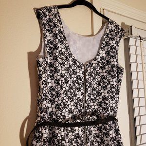 Elegant black and white dress with a beautiful rose pattern and a simple belt at the waist