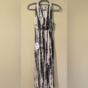 This comfortable white/black maxi dress is perfect for any occasion. Its stylish design offers a flattering fit and timeless appeal. Perfect for a casual outdoor event.