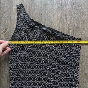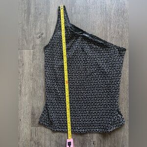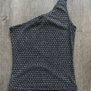 Stylish one-shoulder top featuring a chic black and white pattern. Perfect for a night out or casual wear.