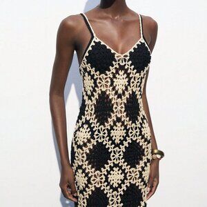 Black and White Party Women's Contrast Color Crochet Knit Sweater Dress