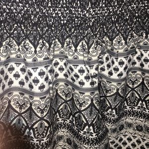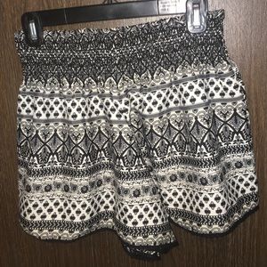 Black, white, and gray shorts with different patterns all over it. It's got a thick elastic waistband. Never worn. It says size small on the tag but they're too big on me and I've got a butt. I would call it more a medium.