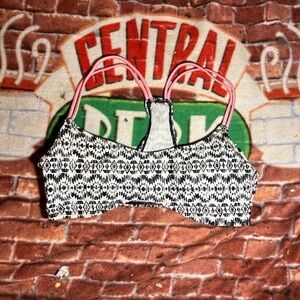 Stylish sports bra with a black and white pattern. Features pink straps for a pop of color.